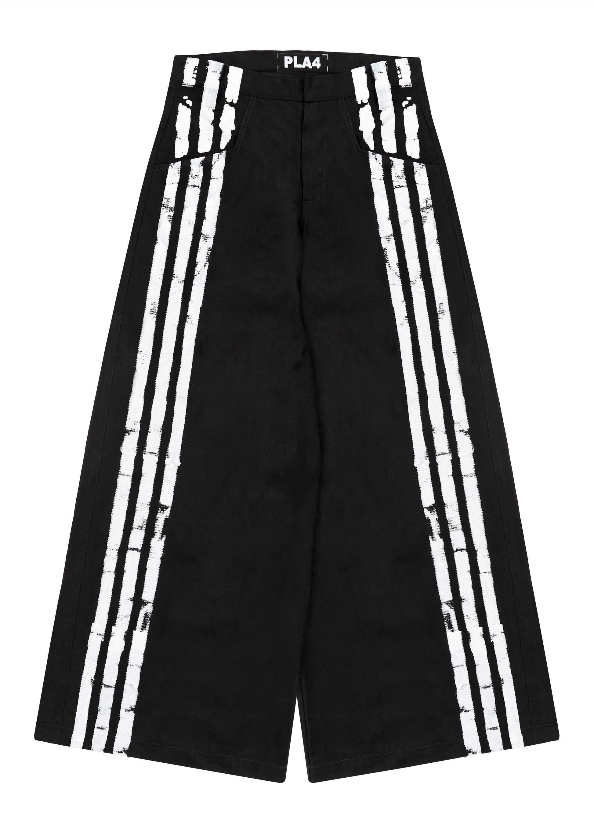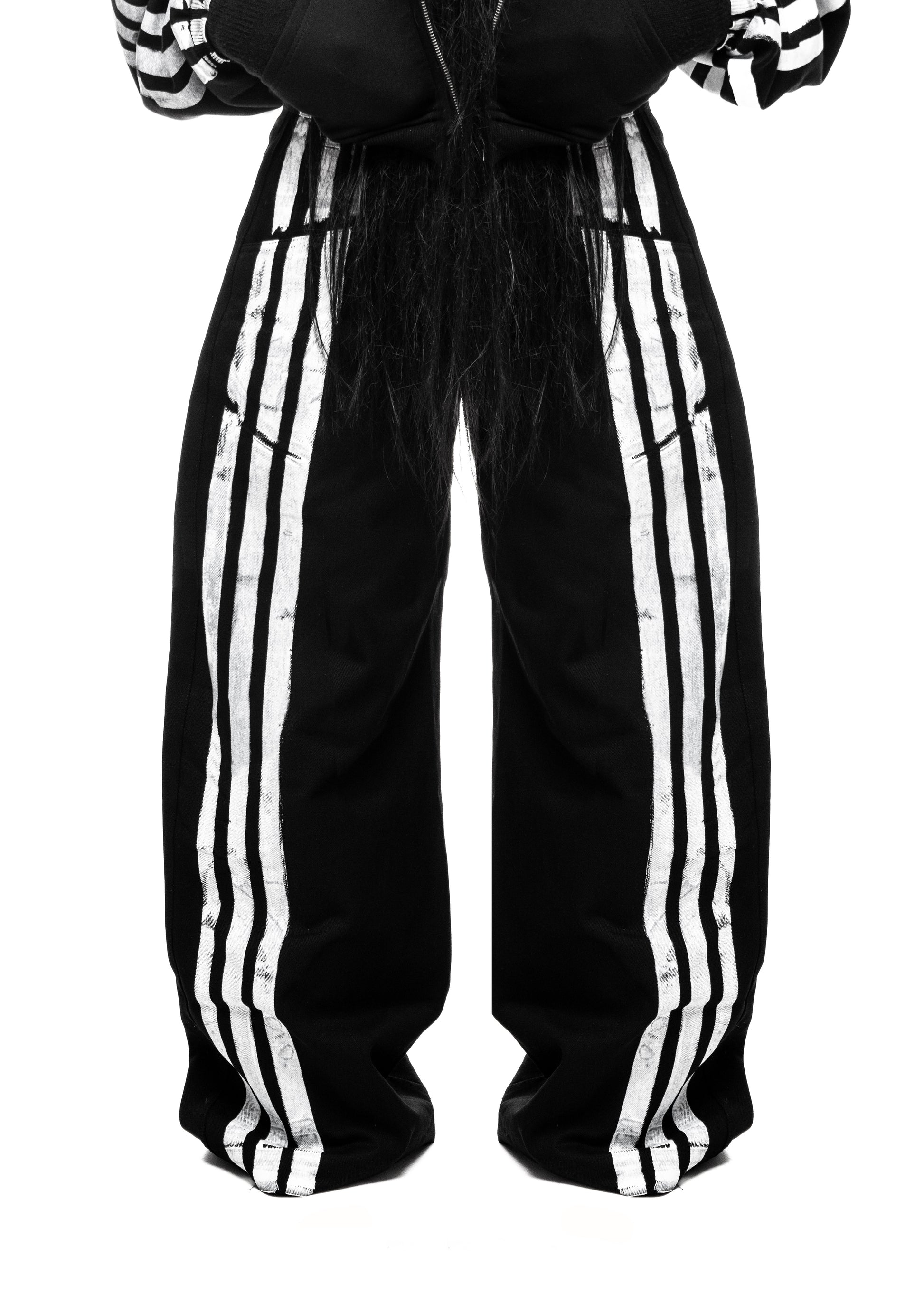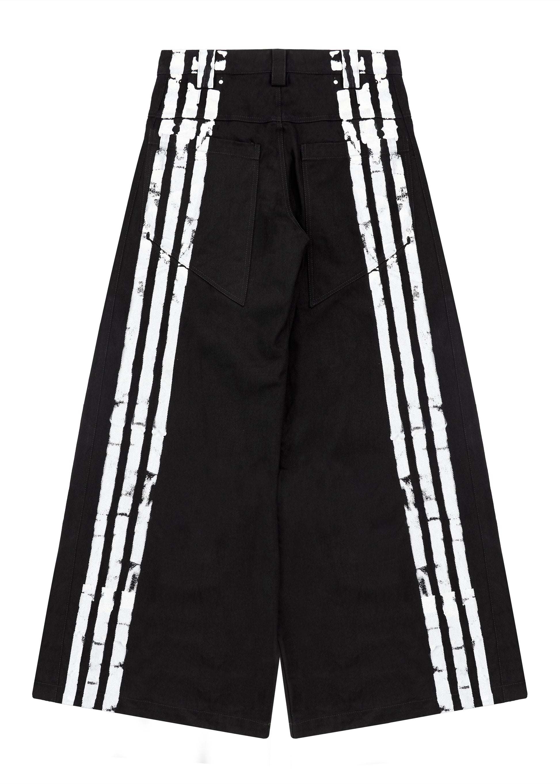 BLACK JEANS WITH WHITE STRIPE PRINT. CRISP AND MONOCHROMATIC. STRAIGHT CUT WITH A RIGID FEEL.